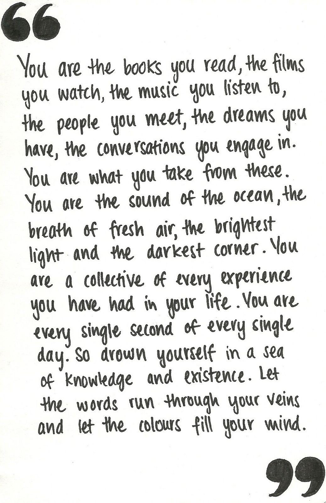 This is a quote from Jac Vanek, a creative fashion designer. For me, this quote is about shaping your life through your own personal perception. Our lives are enriched through books, music, films, and the people and environment that surrounds us. It is easy to forget how much these little things shape us, and how much control we actually have over it.