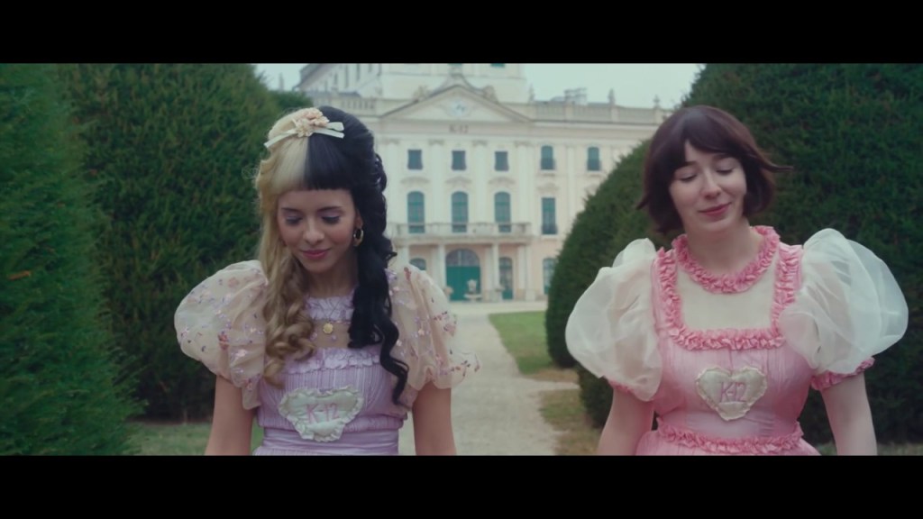 The pink school bus scene is when her first song plays, “Wheels on the Bus.” Crybaby is getting bullied and feels anxious about making friends. But she has already found herself sitting next to a girl she seems to have already clicked with, and they share their fears about not fitting in. A boy walks onto the bus and they smile at each other, but he has been snatched by an aggressively jealous mean girl.