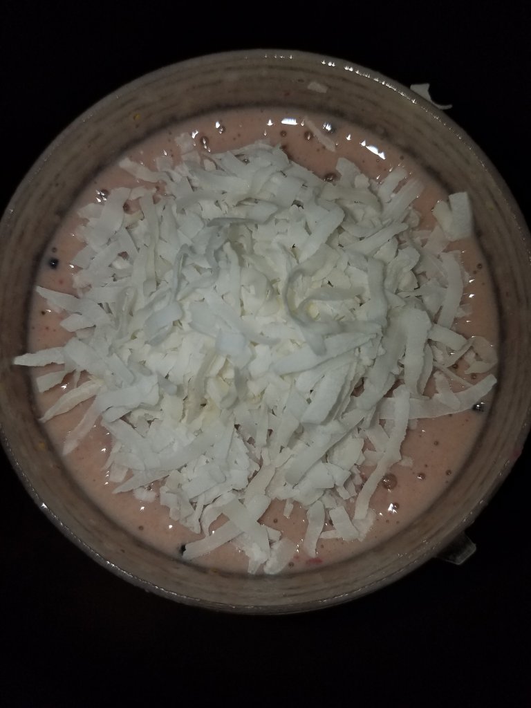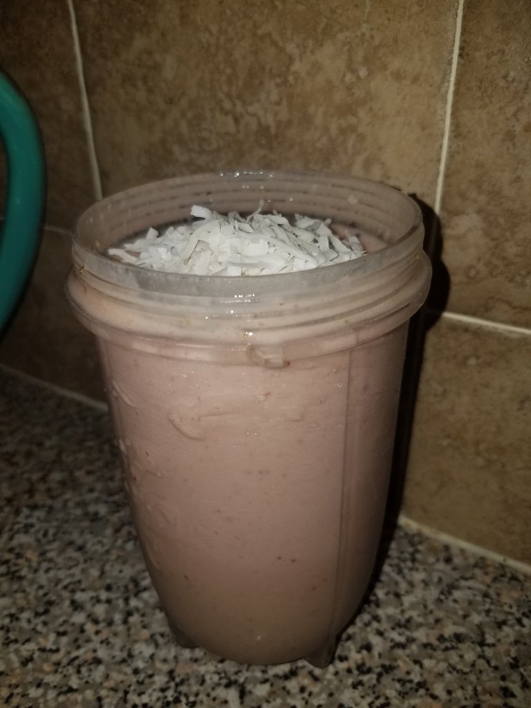 And lastly, for dessert, I made a strawberry banana smoothie with milk, some water, vanilla protein powder, and coconut flakes on top! Soooo delicious!