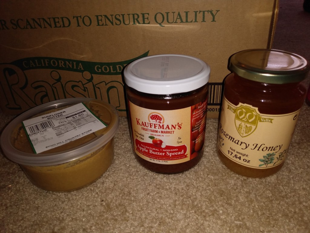 From left to right — sunflower butter, apple butter spread, and rosemary honey.