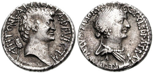 74. New coins were issued of thirty-one-year old Cleopatra, who’s image looked much younger now than she had been portrayed during her teens and twenties. Antonius was depicted on the reverse. Cleopatra’s image was now ‘Romanized’ and said ‘made to look Roman, almost like Antony in drag.’