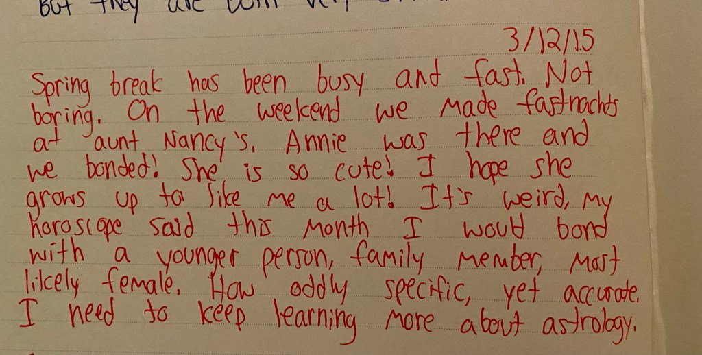 I remember a really great weekend at my aunt and uncles going sledding in their backyard. I spent much of that time with my cousin’s daughter who was just about three years old at the time. That was so fun. I also remember how before that, my horoscope saying “you will bond with a younger family member” and that certainly came true!