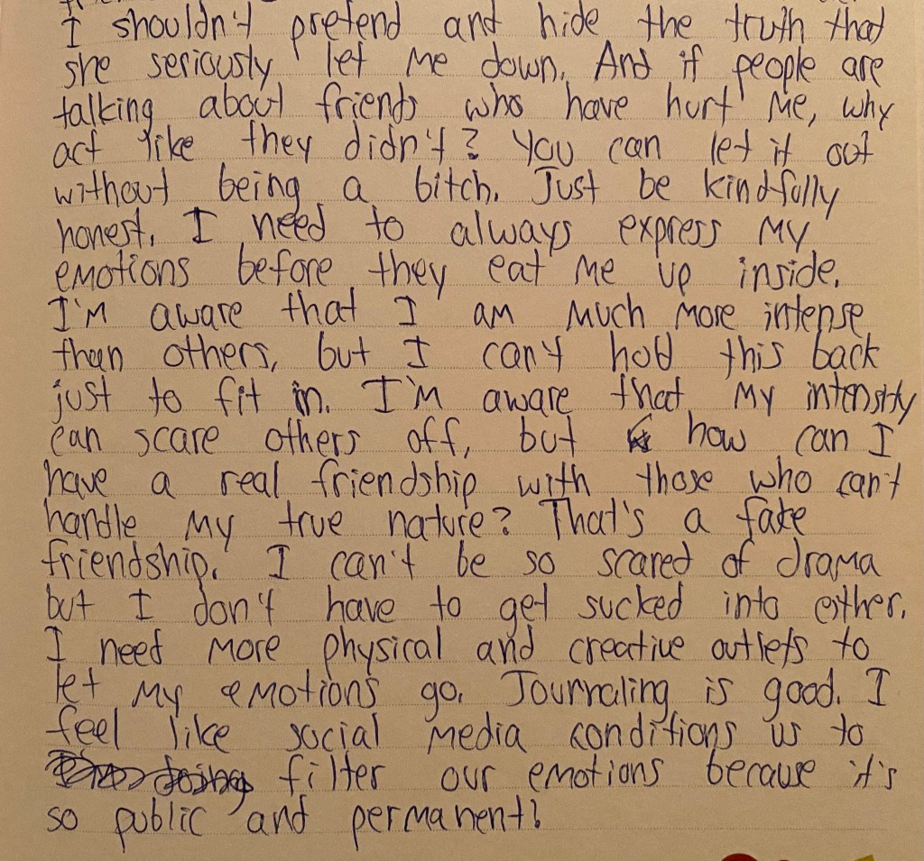 Well, I start this journal already over analyzing and picking apart all of my friendships and all of the people I know. I also want to make a note that I am mainly skimming a lot of what I have written, because it is just so much.