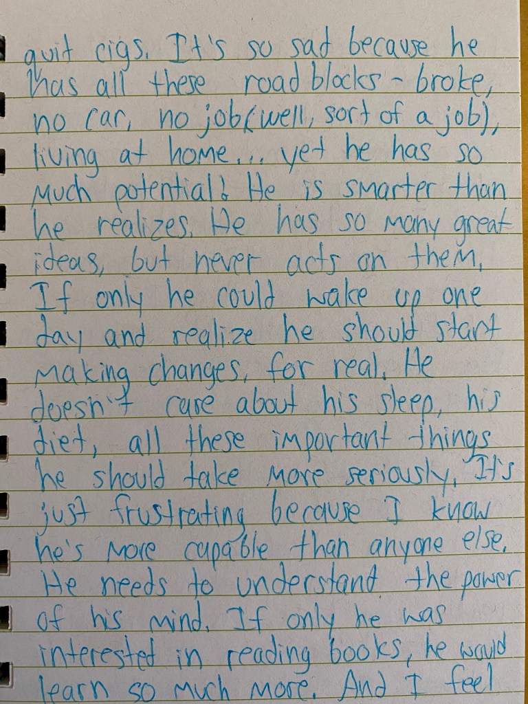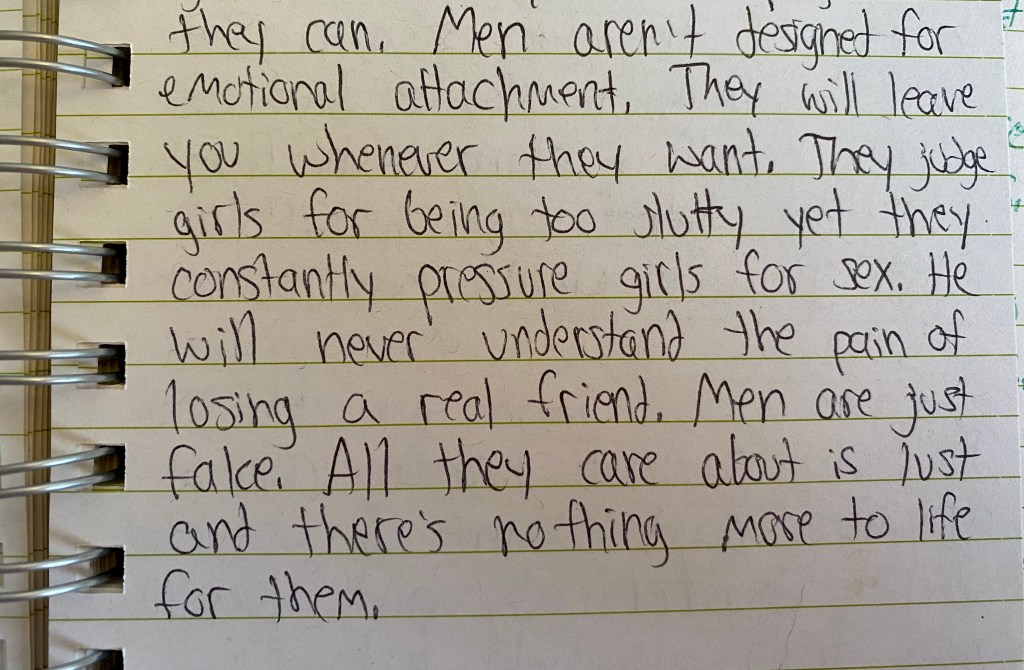 This next part is when my boyfriend at the time didn’t seem to understand why I was getting so upset over a friend I had lost from high school who I had a very emotional and intimate dream about. So I was writing about how men are not sensitive enough to understand why you would be upset about losing a friend.