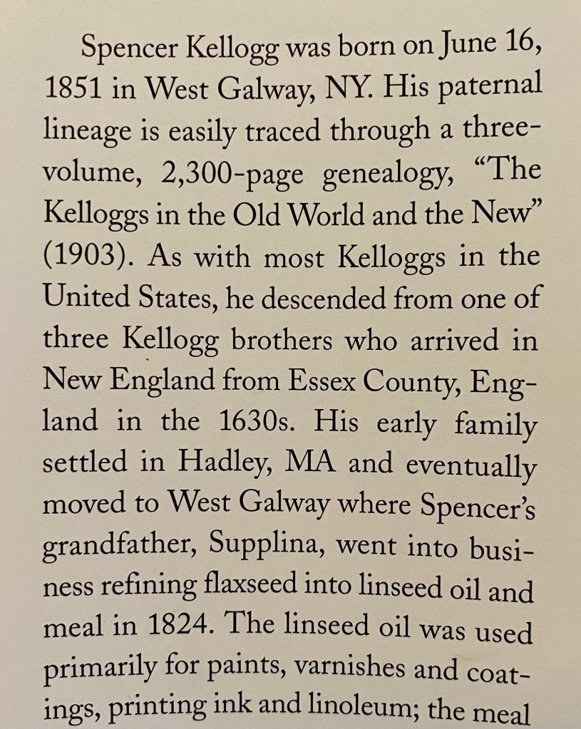 The story begins with Supplina Kellogg, born in 1790, in West Galway, New York. He began a linseed oil business, owning and operating a grist mill (with his neighbors, the Millers) and soon bought another mill in Amsterdam (NY) to save on shipping costs.