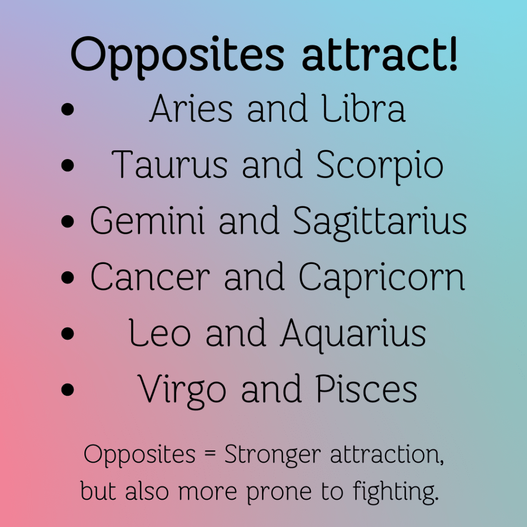 All zodiac signs have their “opposite” signs — pay attention if you have opposite signs from one another. Opposite signs strengthen a bond because it can resemble your “other half,” or parts of yourself that you feel that you lack so you look for in someone else. More polarity equals a stronger attraction. Yet on the contrary, it can also lead to more aggression.