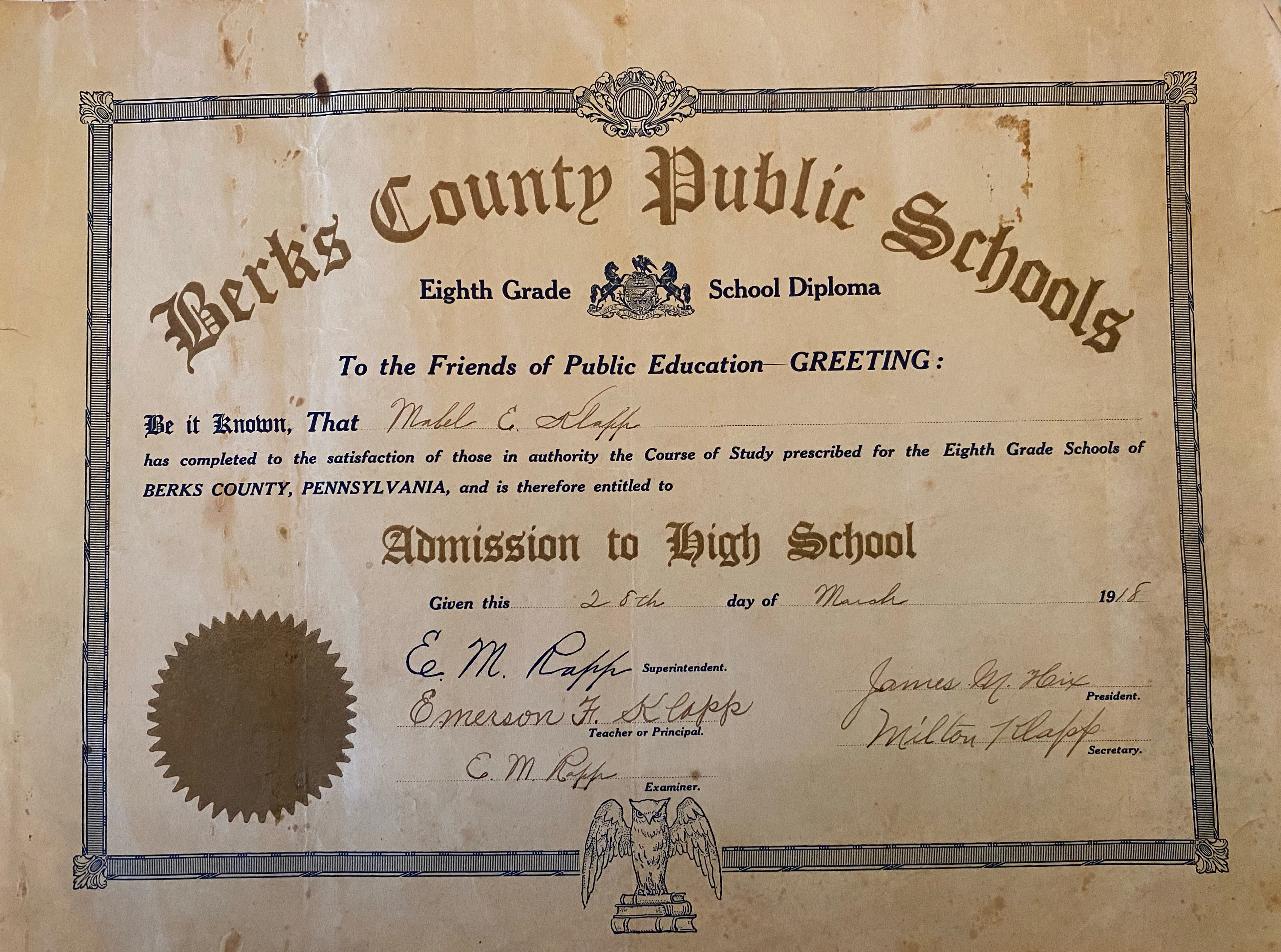 Mabel attended school up until the eighth grade. She was forced to skip high school in order to start working on the farm and helping her family with money. At that time, it was not uncommon for girls to miss out on high school, but Mabel would have finished her education if she could. Below, is her eighth grade graduation diploma.