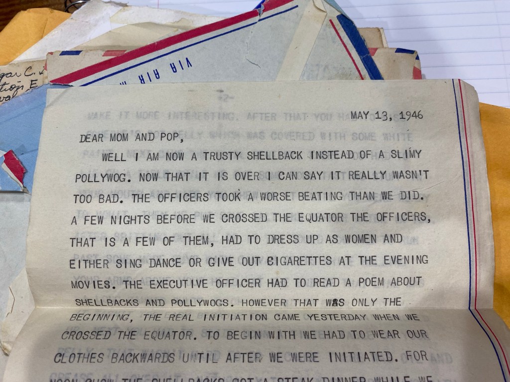 Edgar served in WWII, although according to the stories I’ve been told, his role did not involve much fighting, or something along those lines. He certainly did a lot of traveling. His most memorable moment was crossing the equator, which was a major event. In this letter written to his parents, he describes quite the wildness of it all!