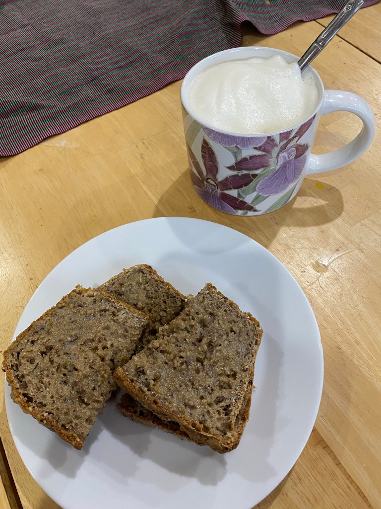Two weekends ago, I stayed over my aunt Nancy and uncle David’s house, and my aunt and I went to her yoga class on Saturday morning. The night before, we had a really delicious “beyond burgers” dinner. And then the next morning, we had a tasty, quick breakfast before yoga — homemade bread and frothy tea. After the early yoga session, we headed back home for brunch for blueberry and banana pancakes. Yum!!!