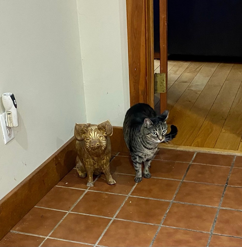 The yoga class was really fun. It was held at my aunt’s church. It was a good pace, enough to work out the muscles but still gentle. And it was also really nice to stay at their home, because it’s deep in the woods which is really cozy and peaceful. I brought the cats with me and they definitely were excited to be there and explore somewhere spacious. And Venus made a new friend — she really liked that golden pig!