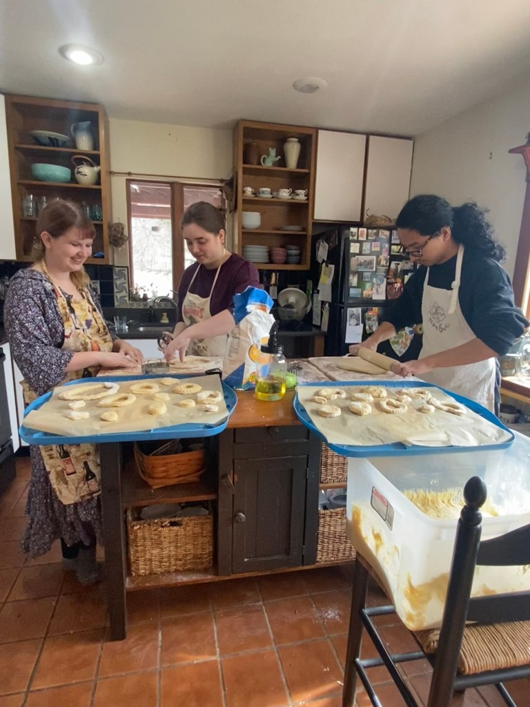 The dough was made on Friday night and then set to rise overnight. On Saturday, we cut the donuts and let the dough rise more on trays. Later in the day, they were fried and ready to eat! We pair them with cinnamon sugar. They are basically doughnuts, but the potato filling gives it a distinct taste, and being homemade makes them extra fresh.